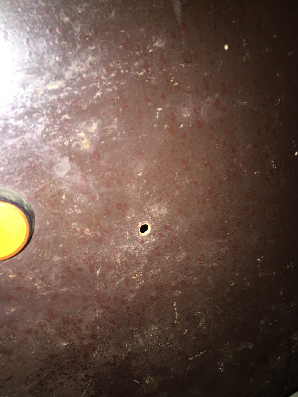 That is a picture of one of many additional holes in the main cabinet body. My current thoughts on how to repair all of the additional holes, is to screw in a similar sized bolt/screw and the cut it off at both sides. That should fill the unsightly holes and possibly just require a small dab of filler/epoxy before the cabinet gets painted/powder coated.