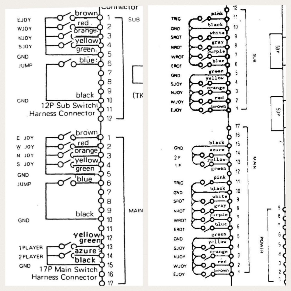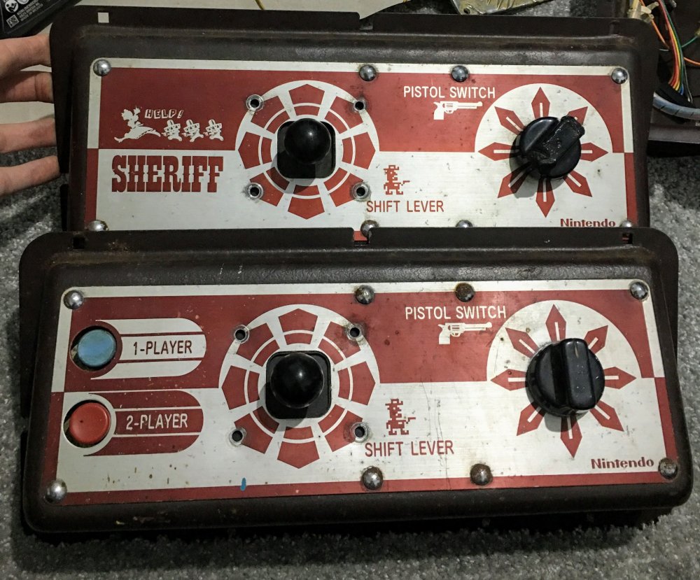 Now whilst these contained the controls, they were still missing wiring looms as both sets of controls I’d got had hacked looms. I’d gone through the wiring diagrams for a few of the early games and discovered they all used the same connectors for the controls, but with differing numbers of wires included (to deal with the additional switches for additional buttons or dials). Below is a comparison of Donkey Kong and Sheriff: