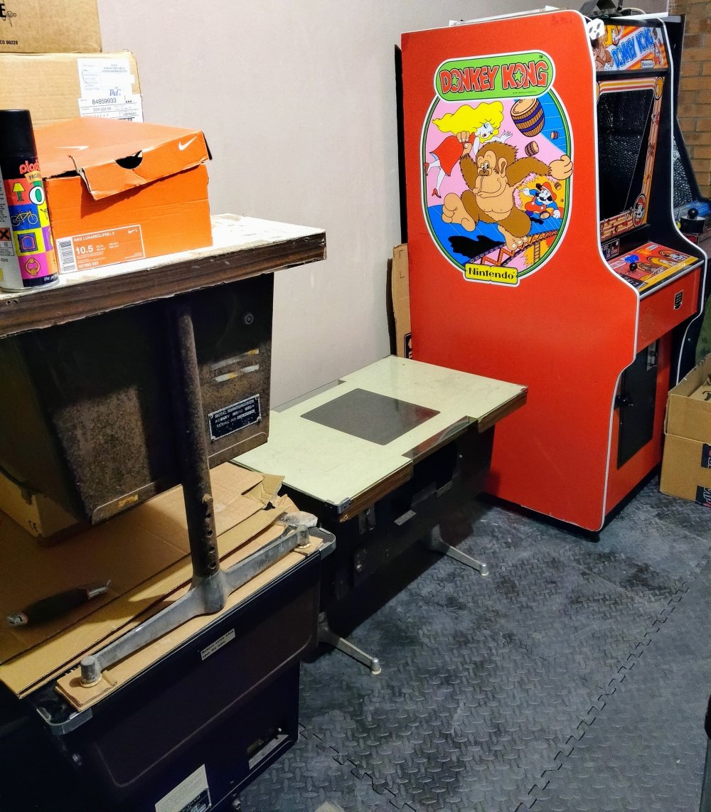 I played with all of the dials on the monitor and managed to stabilise the above image, but still no game. I did wonder at this point is if was my monitor “fix” causing the problem. As the “fix” had left me with a very long video cable, I turned the red Donkey Kong next to the cocktail and plugged the video cable into the Donkey Kong PCB and fired up both cabs: