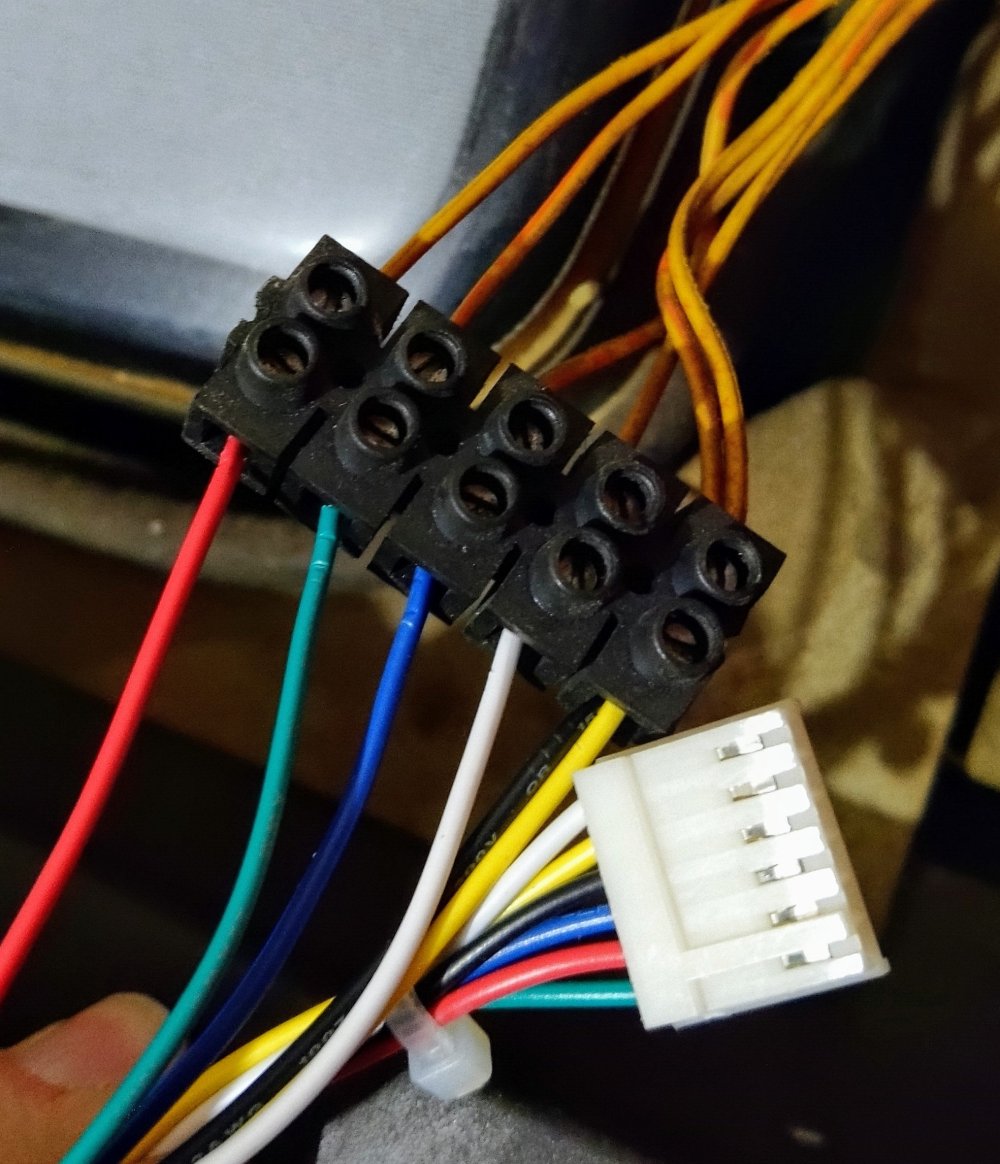 Handily they’d used relevant coloured cabling. The right-hand cables are Blue, Green and Red with Black being ground and White being the sync signal. I’d bought a spare reproduction monitor cable from MikesArcade a few years back and this became the donor to patch the monitor for testing purposes: