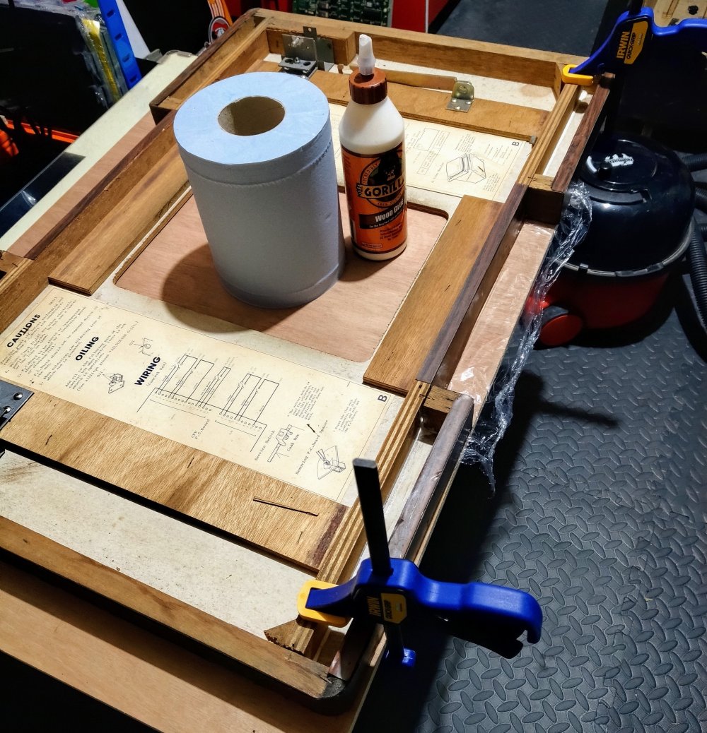 Now that the glass was off, I flipped the lid back over and applied lashings of Gorilla Glue for wood (other wood glues are available) and clamped the piece into place.