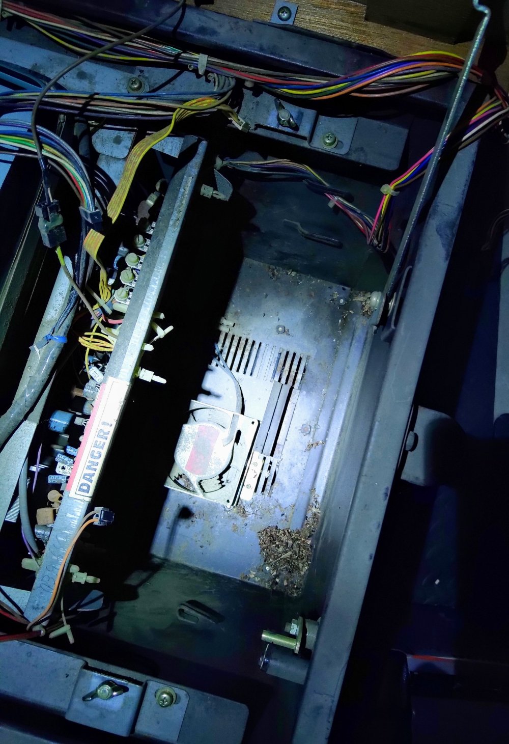 Out came the vacuum cleaner and the bottom of the cab was cleaned out. A quick check over everything else and I dropped the boardset into the cab and connected it up. Now as I mentioned at the start, this would bought as a non-working cab with just the monitor coming on. When I first opened the cocktail I noticed that it had one of the early PP7A power supplies fitted to it. This was the most likely suspect for the non-working status as the boardset worked on my test bench (after a good clean!).